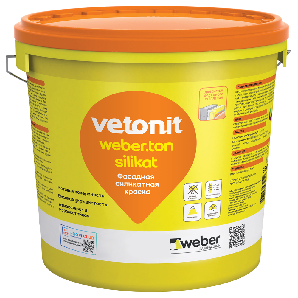 Силикатная фасадная краска для нанесения на потолки и стены, в том числе фасады зданий и сооружений в качестве декоративно-защитного слоя теплоизоляционных фасадных систем. Обладает высокой прочностью сцепления с поверхностью. Подходит для работ при температуре воздуха и основания от +10 до +30°C. Материал обладает морозостойкостью.