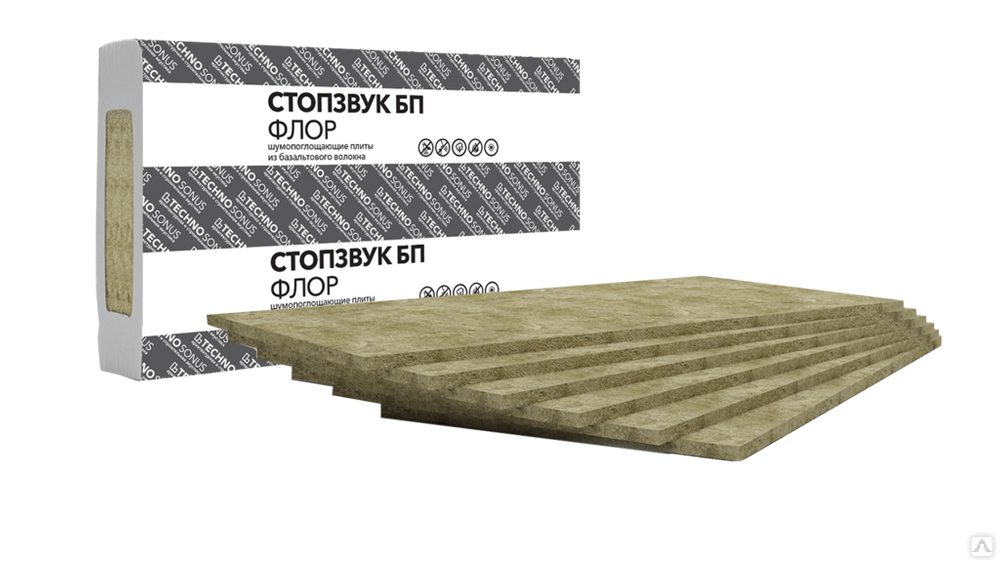 Размер плиты 1200 х 600 х 20 мм, плотность 90-100 кг/м3. Высокая механическая прочность и упругость (которые достигаются большим содержанием природного базальта), а так же горизонтальное направление базальтовых волокон гарантируют максимальный эффект изоляции ударного и воздушного шума конструкциями пола, уложенного на плиты СтопЗвук БП Флор.