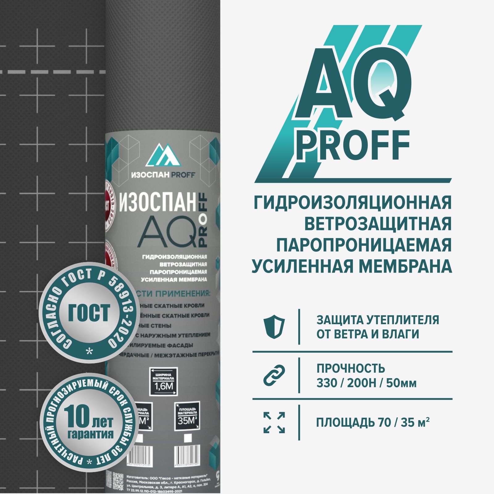 Изоспан AQ proff, 70 м2, Супердиффузионная гидро-ветрозащитная паропроницаемая усиленная мембрана 11.02.00.01.22.188.0035.1600.00 — материал, выполненный из полипропиленовой микропористой мембраны, усиленной с двух сторон полипропиленовым нетканым полотном. Изоспан AQ proff обладает водоупорностью, необходимой для защиты утеплителя и других внутренних элементов конструкций здания от подкровельного конденсата и атмосферных осадков, проникающих под внешнее покрытие (кровлю / наружную обшивку), при этом является паропроницаемым материалом, поэтому не препятствует выходу водяных паров из утеплителя в вентилируемый зазор. Гидро-ветрозащитная мембрана Изоспан AQ proff препятствует конвективному движению воздуха через теплоизоляцию, снижая теплопотери. Высокая прочность материала позволяет применять его в условиях повышенных нагрузок при монтаже (погодные условия, сложность конструкции, продолжительность монтажа) и эксплуатации.