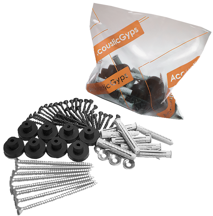 Комплект крепежа предназначен для крепления звукоизоляционных панелей АкустикГипс Бэйсик к несущему основанию стен, потолков, перегородок. Основным элементом комплекта является изолятор специально разработанной формы на основе резины, который служит в качестве виброизолирующего крепежного узла, препятствующего передаче звуковых волн от несущей конструкции на внешнюю поверхность панелей.